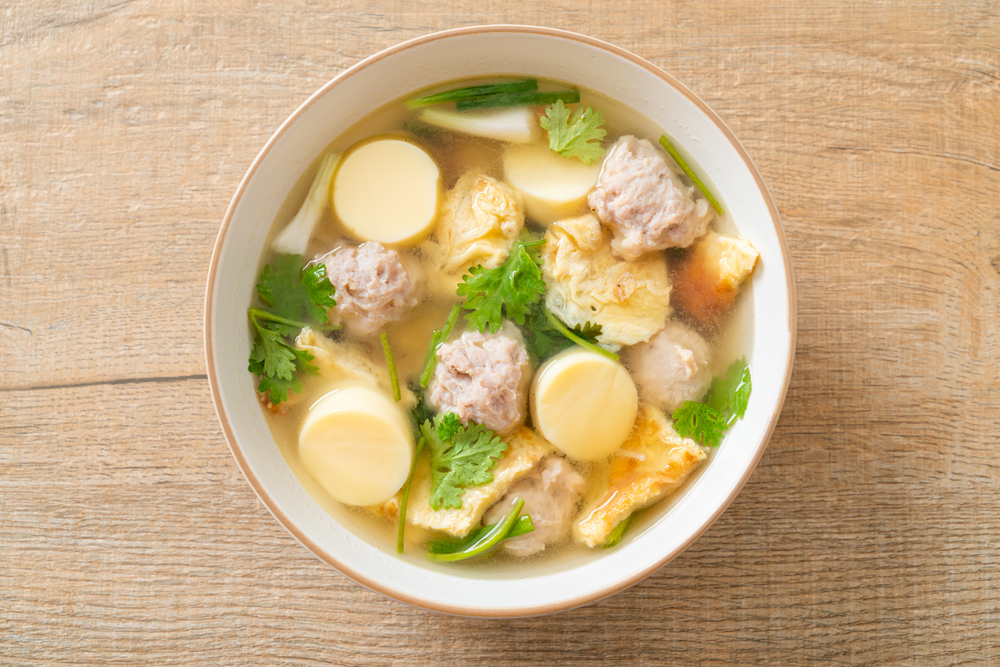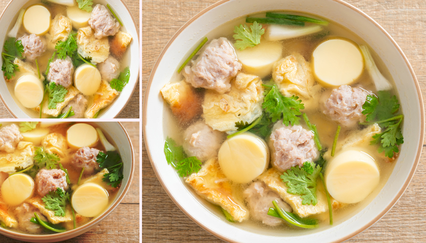 ใส่หมูสับปั้นก้อนกลมลงไปต้มจนสุก ตามด้วยไข่เจียวที่หั่นเตรียมไว้และเต้าหู้ไข่ ชิมรสตามใจชอบ