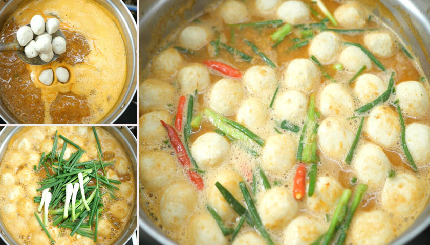 ปรุงรสด้วยผงปรุงรส น้ำปลา ปรุงรสได้ตามชอบ แน่นอนต้องมีรสชาติเผ็ด เค็ม นัวๆ จากน้ำปลาร้า (ชิมรสชาติก่อนใส่น้ำปลา ปลาร้าจะมีรสชาติเค็ม) ใส่ลูกชิ้นปลาที่เราต้มไว้แล้ว ต้มต่อไปจนทุกอย่างสุกแล้ว ตามด้วยต้นหอม พริกจินดาสีแดง เพิ่มสีสัน และความเผ็ดร้อน เท่านี้ก็เสร็จเรียบร้อยขนมจีนน้ำยาป่า ปลากระป๋องสูตรง่ายๆ