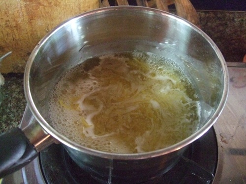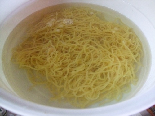 จากนั้นก็จะมาต้มบะหมี่ เอาบะหมี่ล้างน้ำก่อนค่ะ