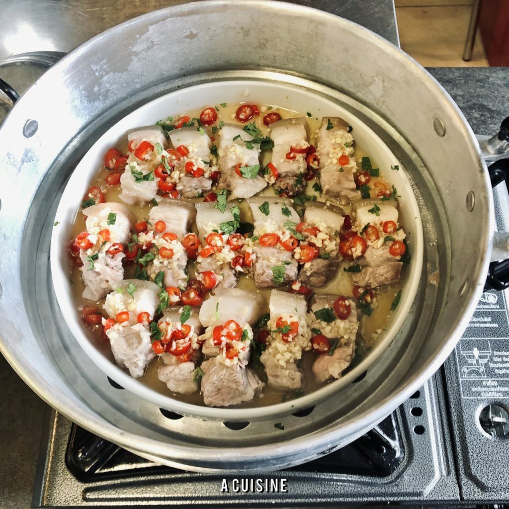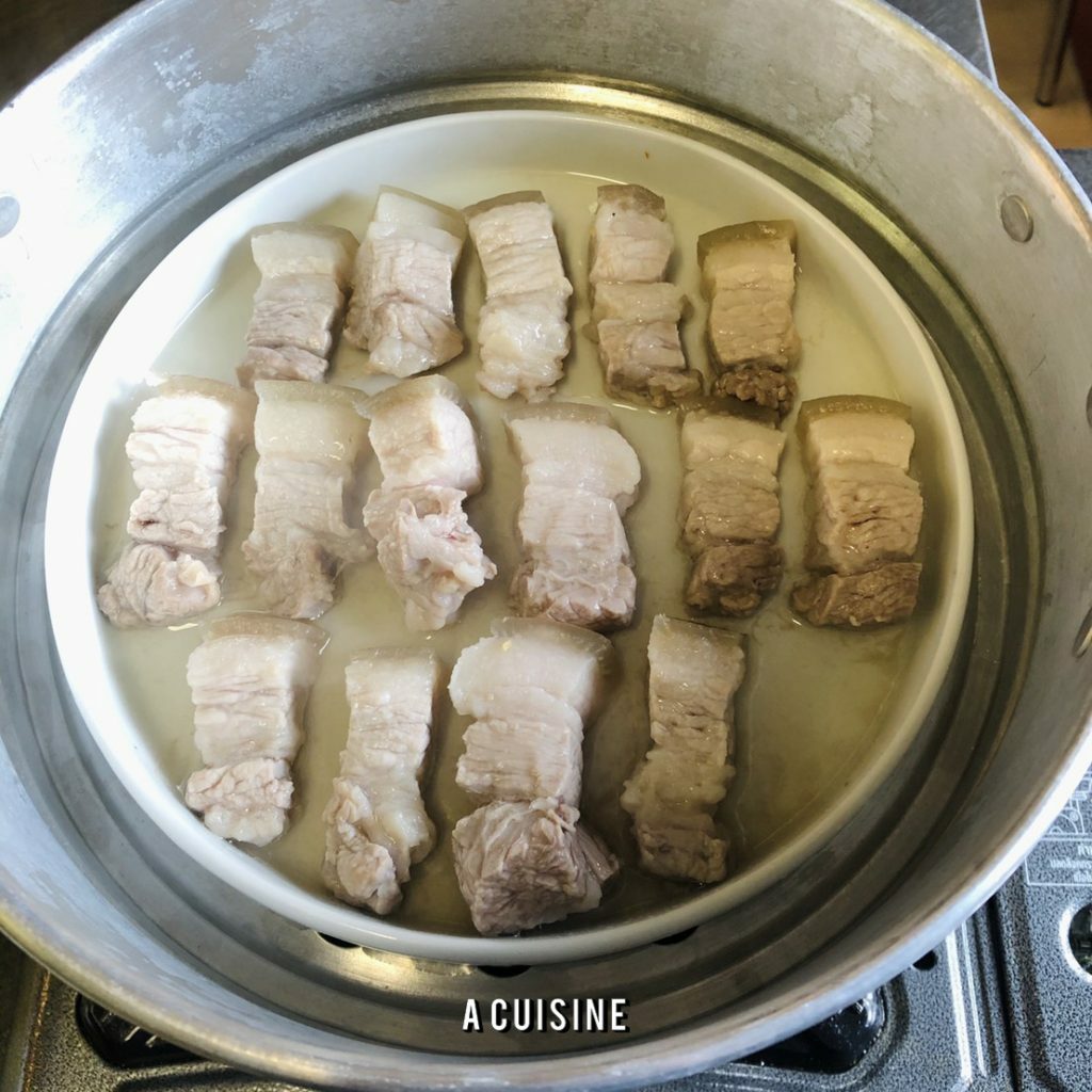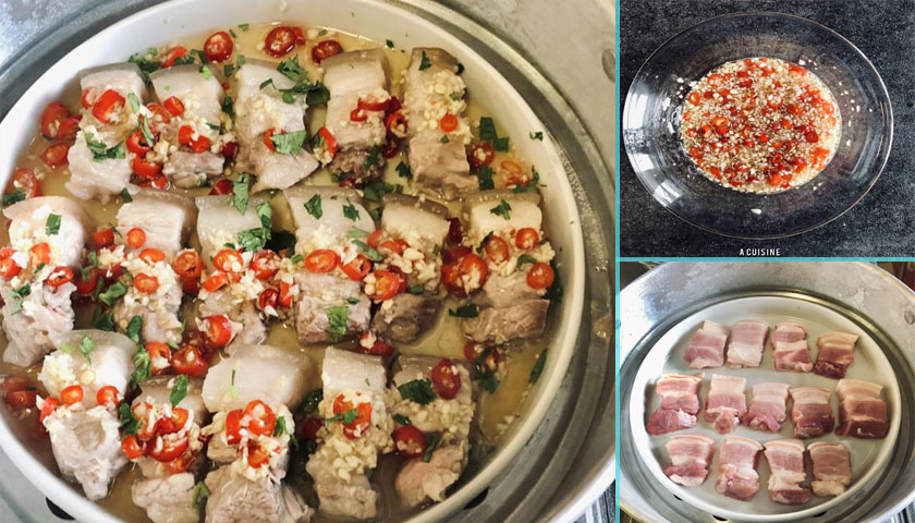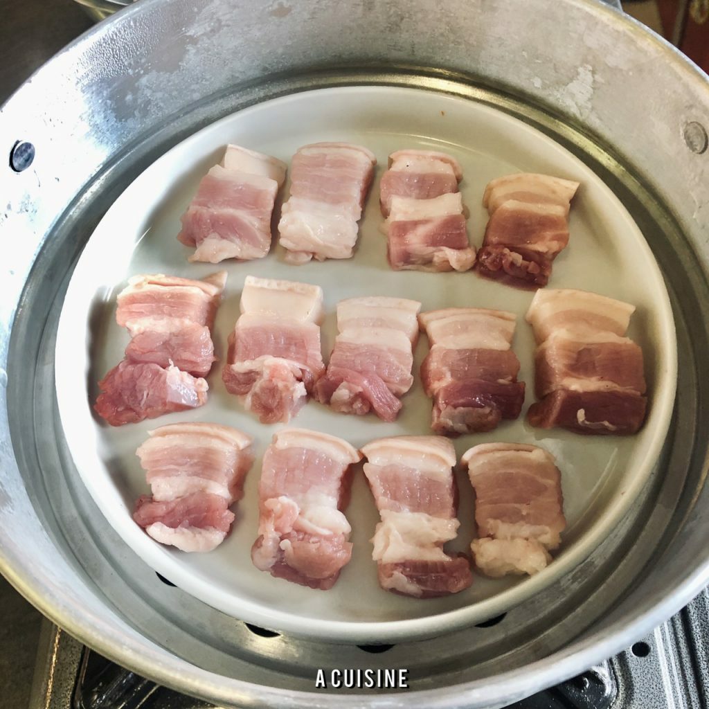 เตรียมจานสำหรับเข้านึ่ง วางหมูสามชั้นลงไปตามใจชอบ ตั้งหม้อนึ่งน้ำเดือดจัด นำหมูสามชั้นไปนึ่งนาน 5 – 8 นาที แล้วแต่ความหนาของชิ้น