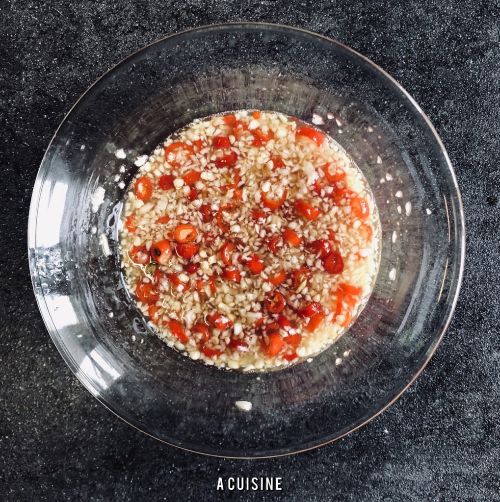 เตรียมน้ำยำ โดยใส่ น้ำปลา น้ำมะนาว น้ำตาลทราย คนให้น้ำตาลละลาย จากนั้นใส่ กระเทียมสับ พริกแดงจินดา คนผสมให้เข้ากันเตรียมไว้