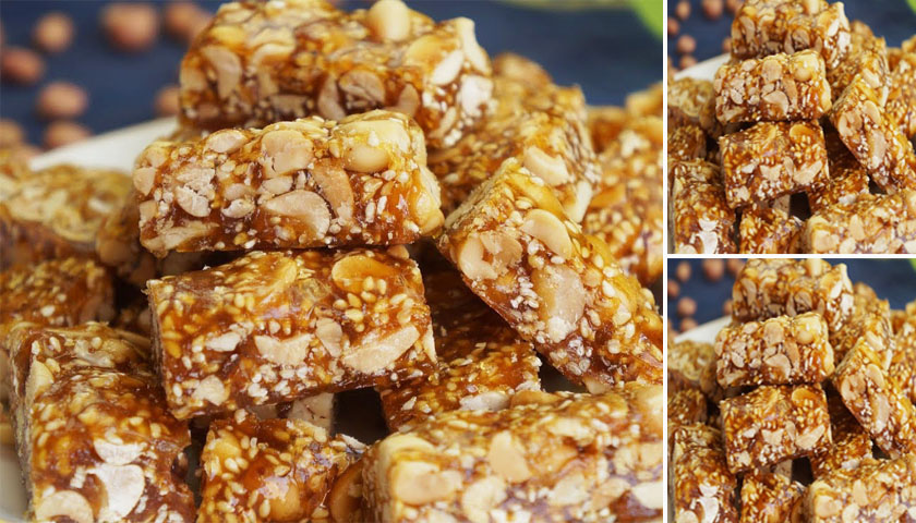 – เทถั่วลิสงที่คั่วไว้ลงไปในน้ำเชื่อมที่เคี่ยวจนข้นเหนียว