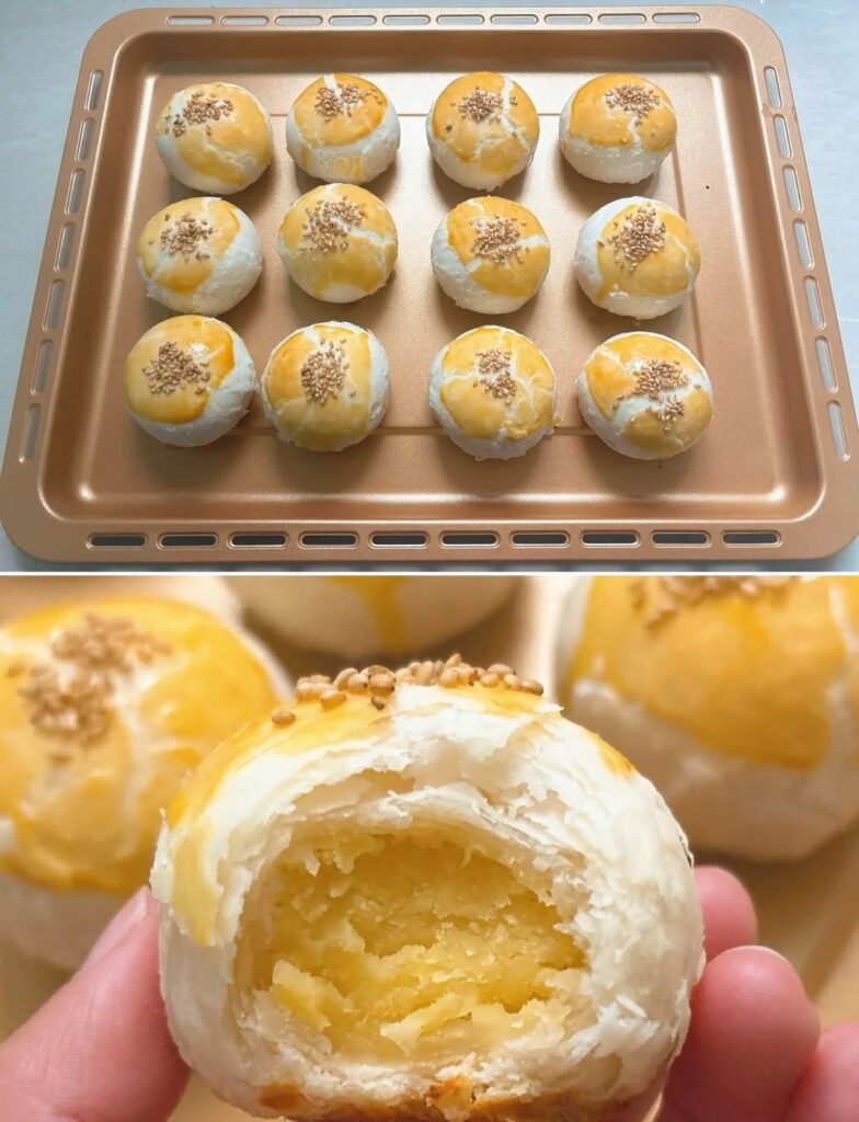– อบที่ 170 องศาเซลเซียส (ไฟบนล่าง) ประมาณ 15–20 นาที หรือจนผิวเหลืองสวย เสร็จแล้ว! ได้ขนมเปี๊ยะเนื้อนุ่ม ไส้แน่น หอมอร่อย พร้อมเสิร์ฟ