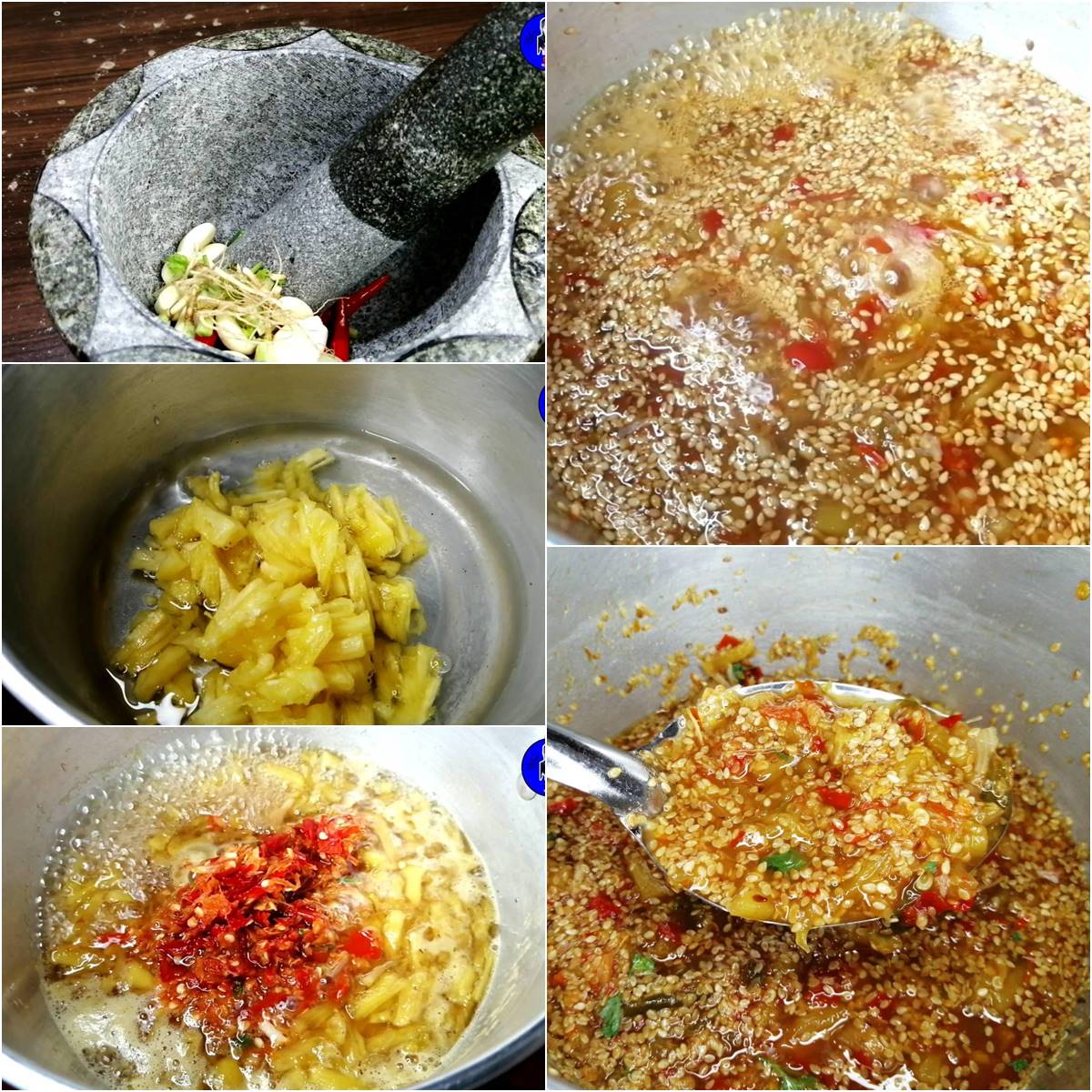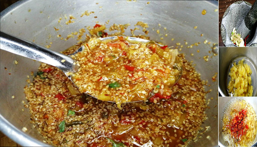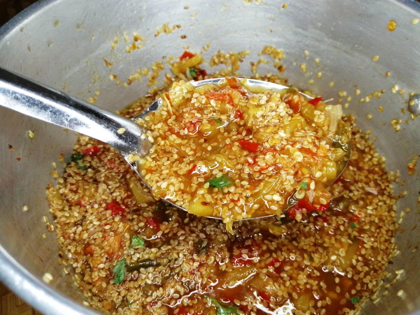 4. ใส่พริกที่ตำไว้ลงไป ตามด้วยน้ำปลา น้ำส้มสายชู ผงชูรส งาขาวคั่ว และเคี่ยวจนเดือดอีกครั้ง
