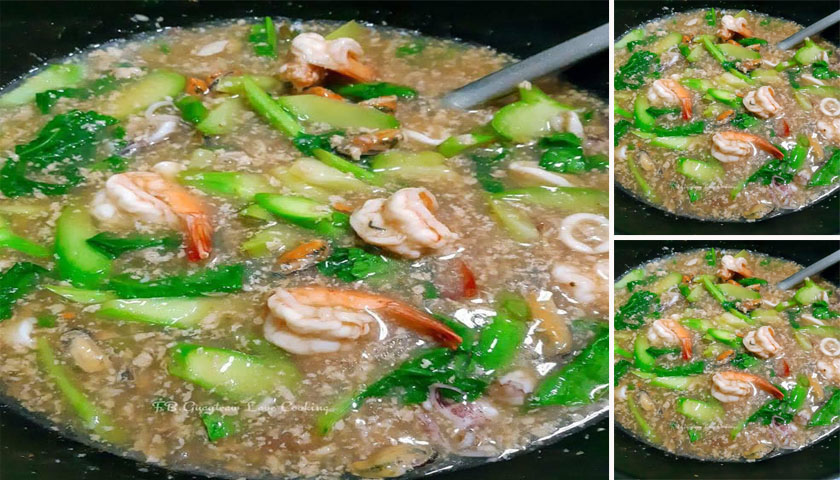 ปล่อยน้ำซุปให้เ ดื อ ดจนหมึกกุ้งหอยสุ ก น้ำหมักก็จะเซ็ตตัว ตัวจับกันเป็นลิ่ มๆ เพราะในน้ำหมักมีไข่ที่หมักผสมไว้