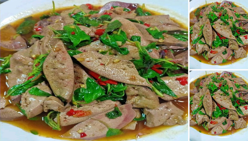 2.หั่นตับหมูสดเป็นชิ้นพอคำ ขยำกับน้ำส้มสายชูแล้วนำไปล้างผ่านน้ำเปล่า 2 รอบ นำตับมาขยำกับนมสด