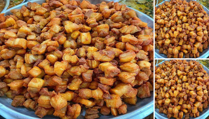1. หมูสามชั้นหั่นชิ้นเต๋าใหญ่ (เพราะเวลาทอดจะหดตัวได้ชิ้นน้อย) คลุกเคล้ากับเกลือ (เพื่อดับกลิ่นคาวของเนื้อหมู) จากนั้นนำไปล้างสะเด็ดน้ำให้แห้ง