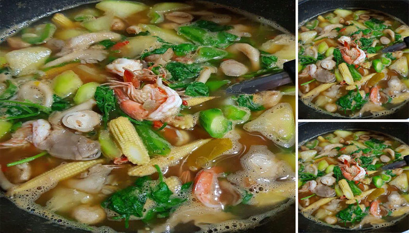 5. พอน้ำแกงเดือดอีกครั้ง ให้เตรียมผักลงใส่ตามลำดับความสุกช้าหรือเร็ว คือให้ใส่ผักที่เนื้อแข็งสุกยากลงไปก่อนแล้วค่อยตามด้วยผักที่สุกง่าย
