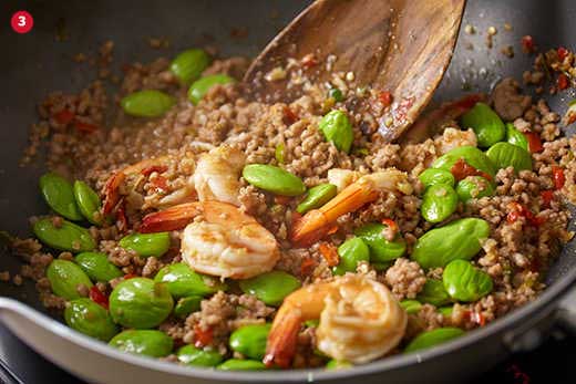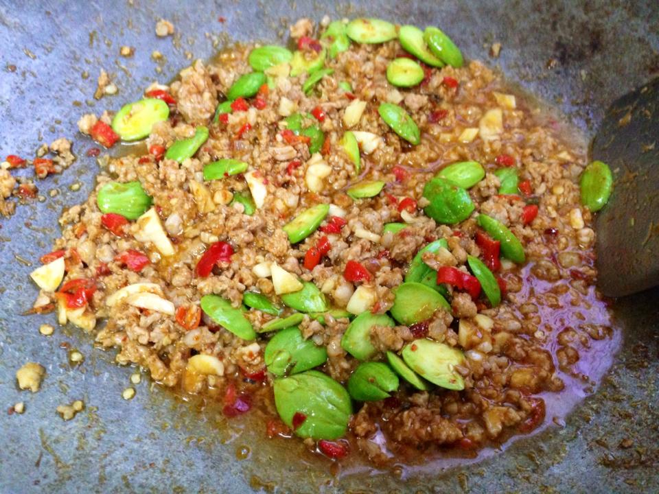 ตามด้ายหมูสั บ ผัดจนหมูเกือบสุ ก เติมน้ำเปล่าอีกนิดหน่อย จากนั้น ใส่สะตอพร้อมกุ้งและใบมะกรูด