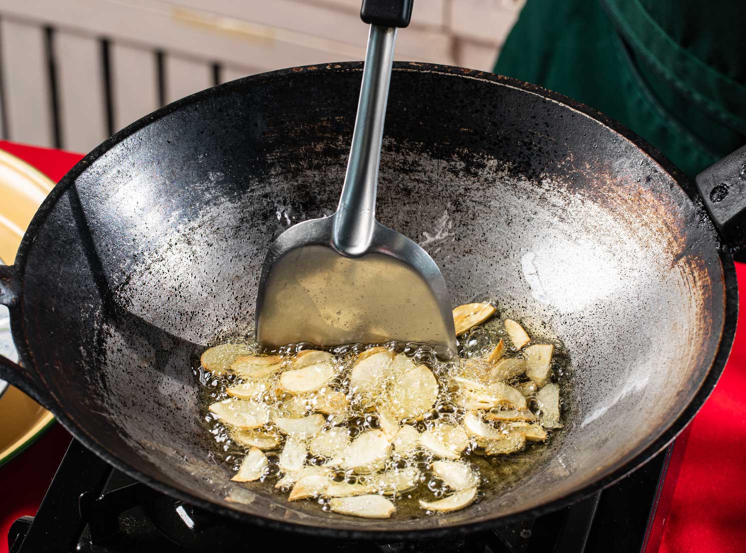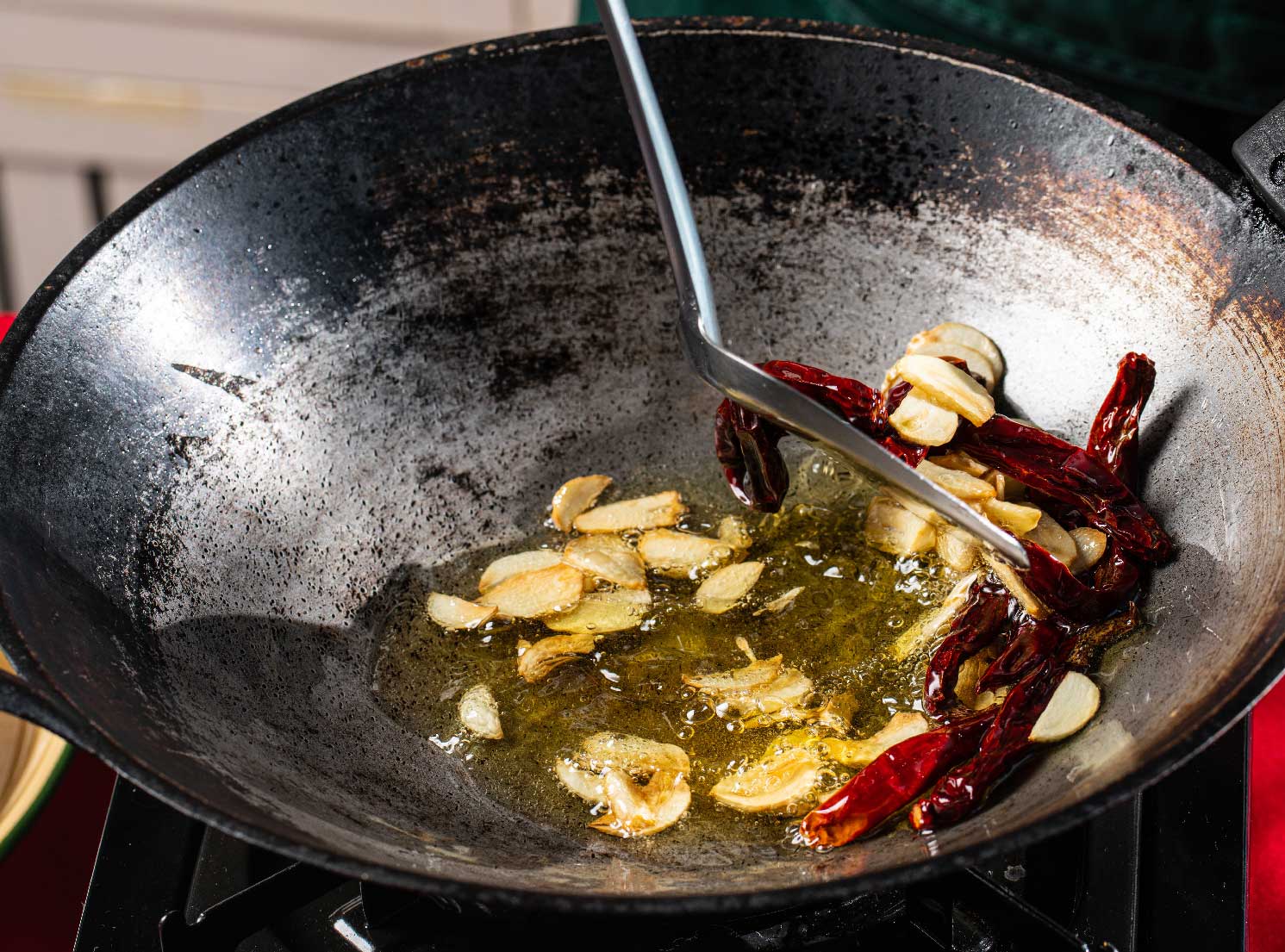 - ตั้งกระทะน้ำมันพืชบนไฟกลาง นำกระเทียมลงไปเจียวจนเกือบสุก ใส่พริกชี้ฟ้าแห้งลงทอด ทอดจนกระเทียมและพริกชี้ฟ้าแห้งสีสวย ตักขึ้นพักไว้