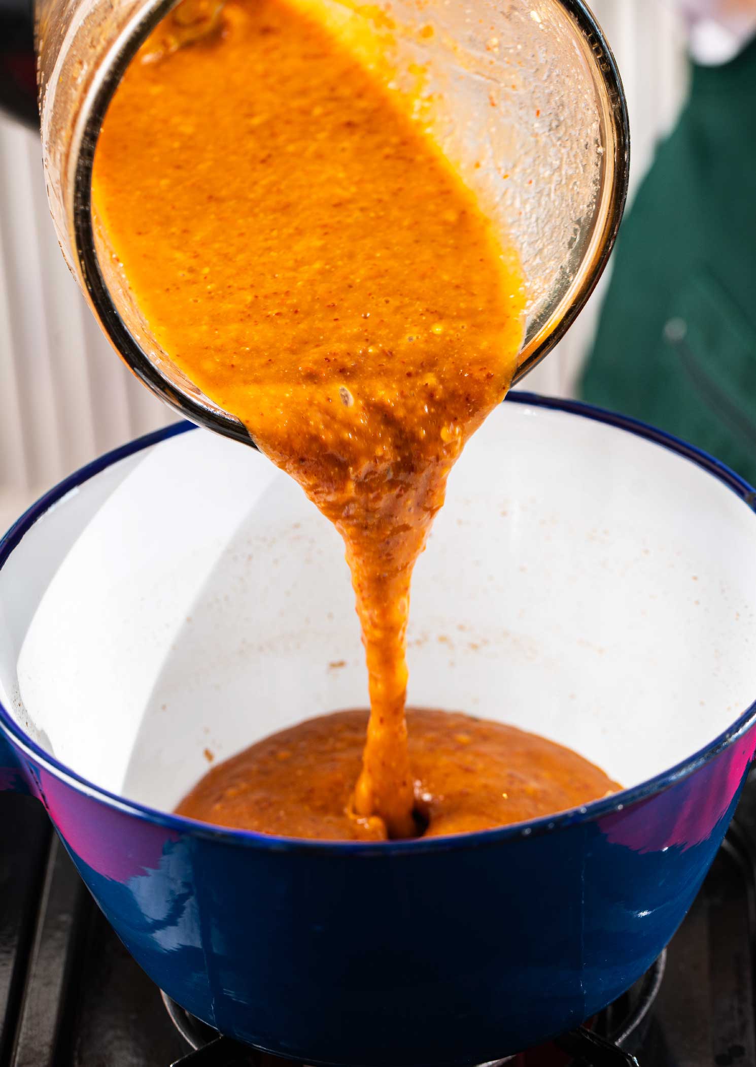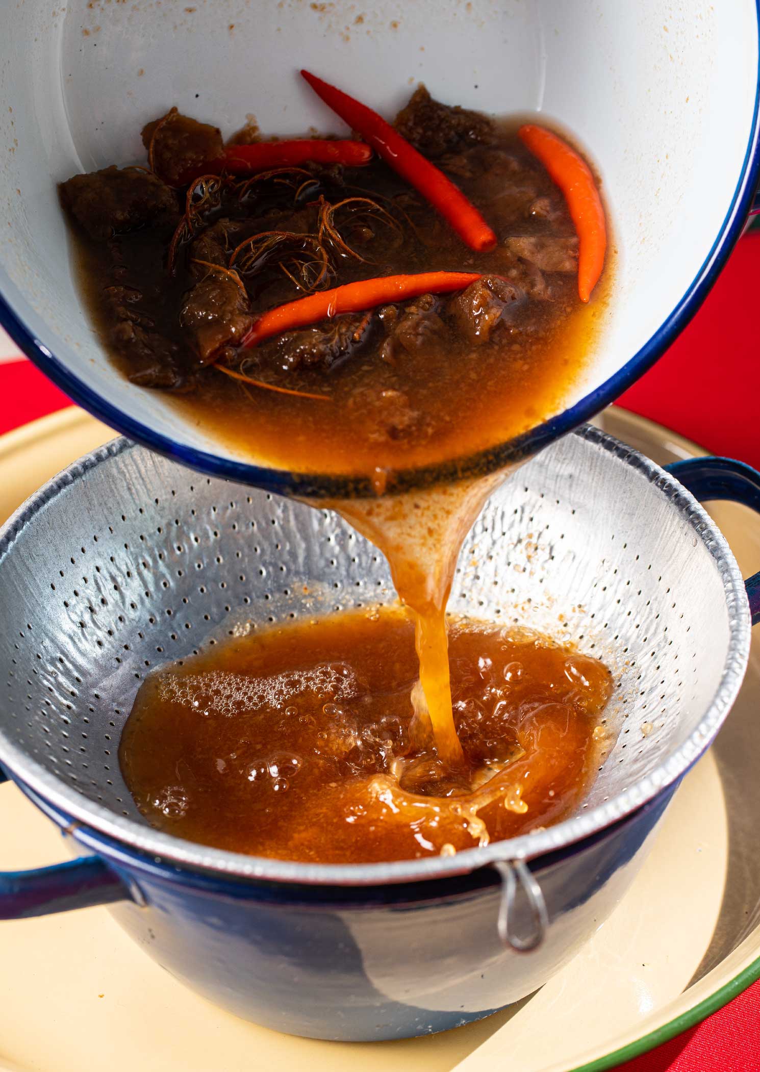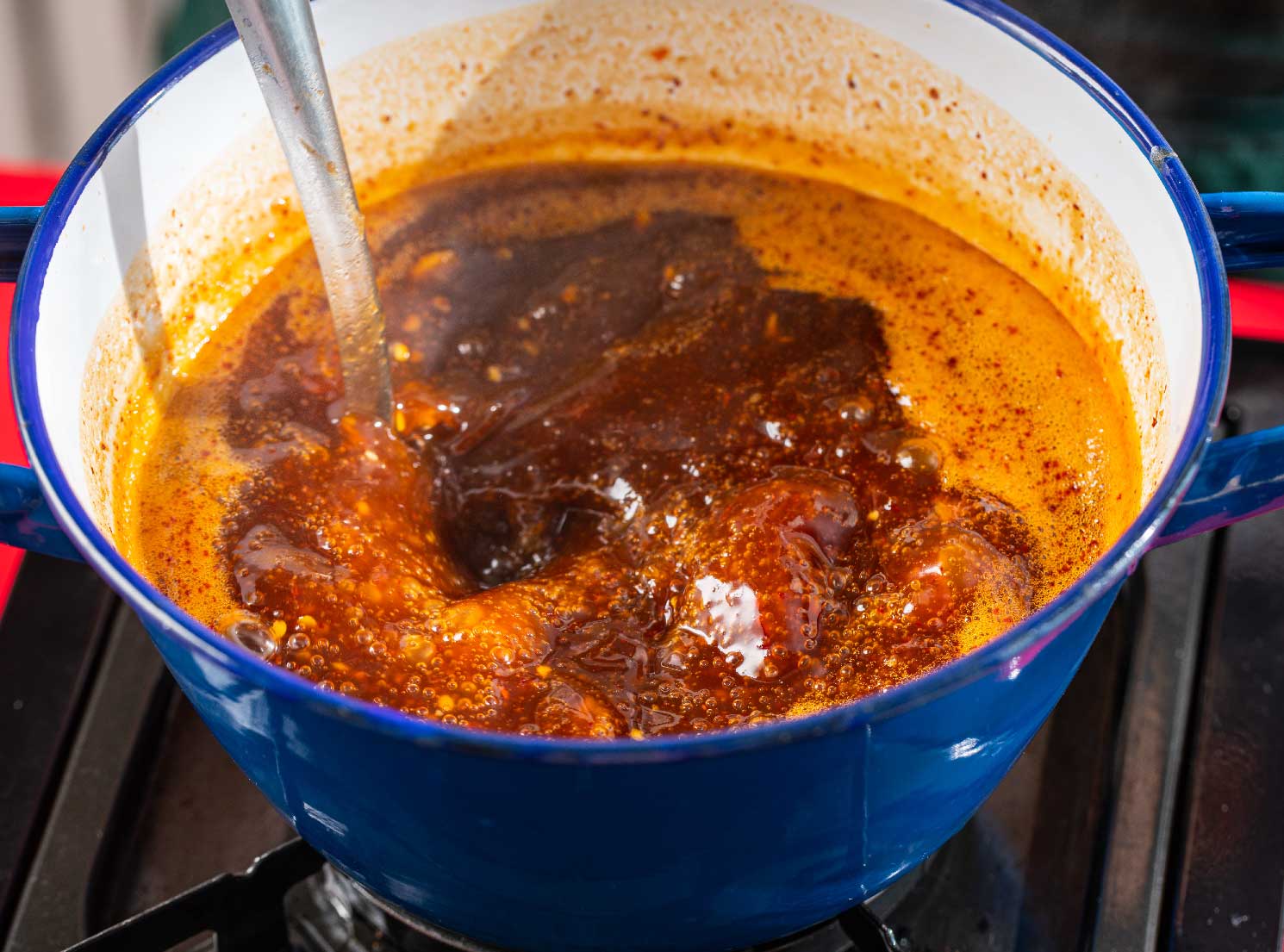 - นำน้ำมะขามเปียกที่พักไว้ใส่โถปั่น ตามด้วยกระเทียมเจียวและพริกชี้ฟ้าทอด ปั่นจนพริกและกระเทียมละเอียดดี นำกลับลงไปใส่ในหม้อ จากนั้นเติมน้ำเปล่า 1 ถ้วยที่เหลือลงในโถปั่น กลอกโถไปมาจนสะอาด แล้วเทน้ำลงในหม้อใบเดิม นำขึ้นตั้งไฟกลางค่อนอ่อน ใส่น้ำตาลทรายไม่ขัดสี น้ำตาลมะพร้าวและเกลือสมุทร ใช้เวลาเคี่ยวประมาณ 5 – 10 นาที หรือจะเคี่ยวจนกว่าได้ความข้นเหนียวที่ต้องการ และให้หมั่นคนน้ำจิ้มอยู่สม่ำเสมอ เพื่อไม่ให้ไหม้ก้นหม้อ ครบเวลา ปิดไฟ พักให้หายร้อน โรยด้วยพริกแห้งทอด ผักชีหรือผักชีฝรั่งหั่นท่อน