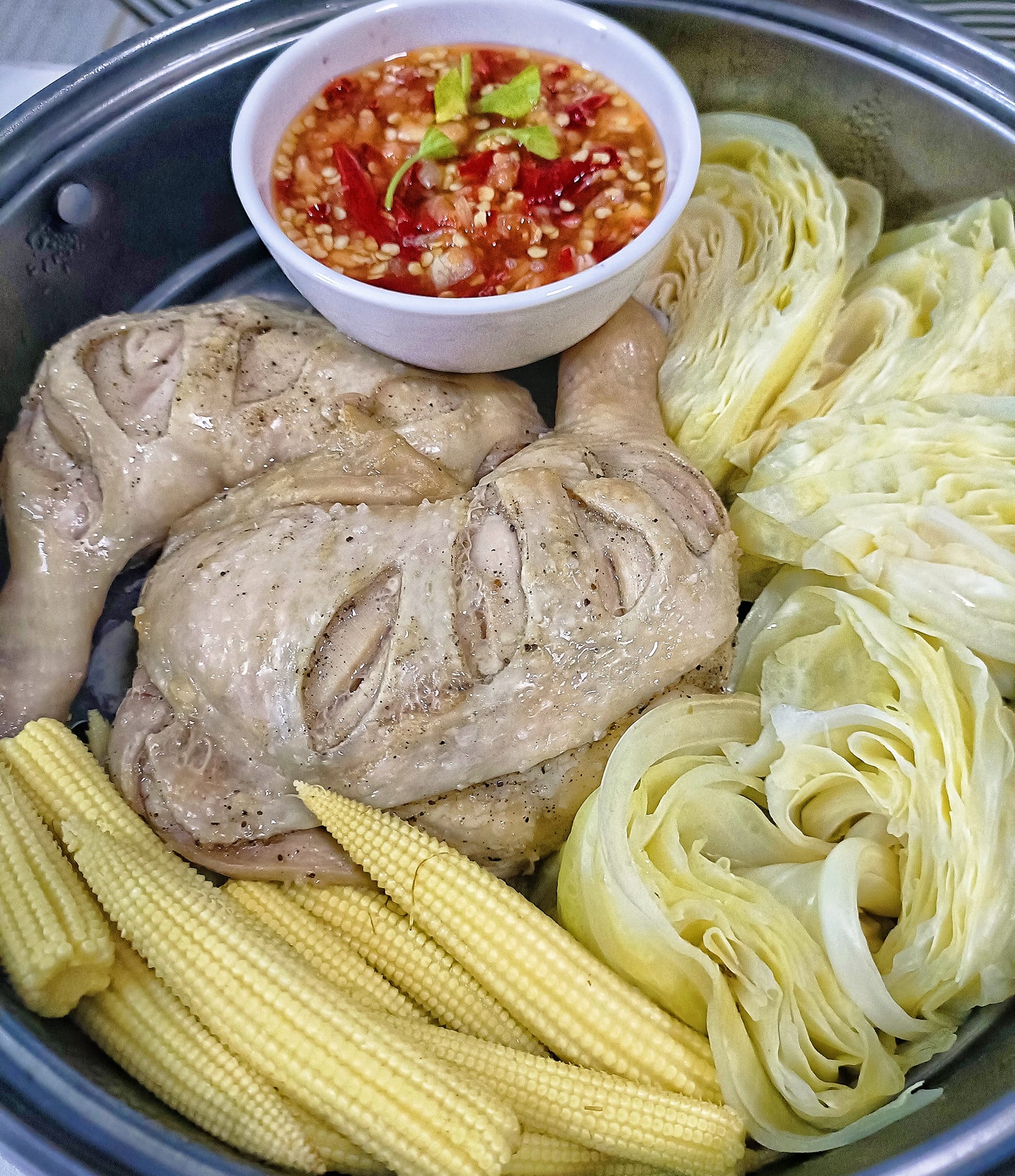 7.นำไก่นึ่งมาจัดเสิร์ฟ คู่กับน้ำที่ได้จากการนึ่งไก่